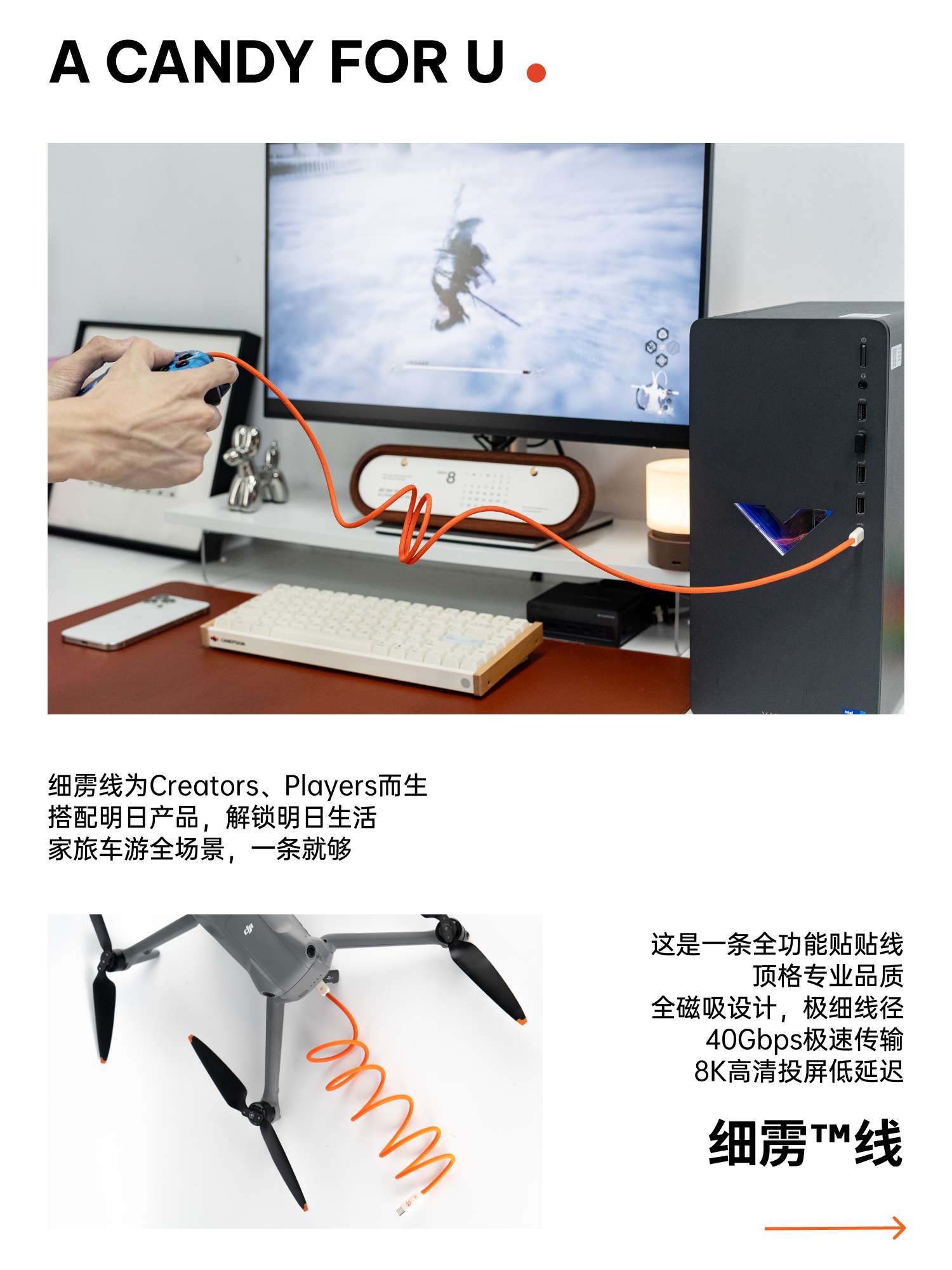 2️⃣ 无法拒绝的40Gbps全功能贴贴线:细雳线,40Gbps极速传输、8K高清投屏,家旅车游多场景,选这一根就够啦。