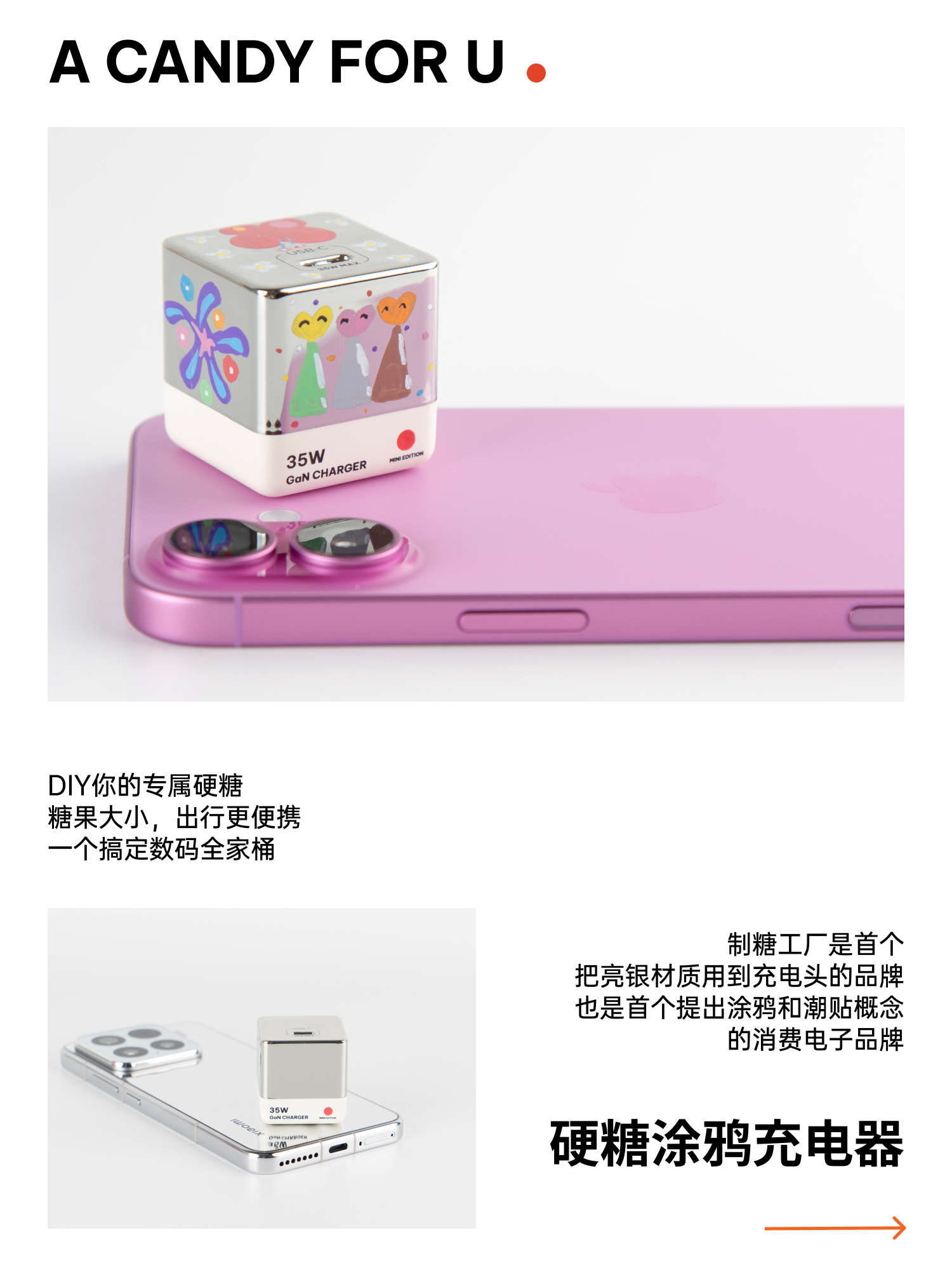 💡 **硬糖系列充电器设计精巧,满足不同充电需求:** 制糖工厂的硬糖系列充电器也成为了此次双十一的亮点之一。硬糖67W充电器体积小巧,仅有AirPods大小,却可以同时支持2C1A三个设备的快充,并且插脚可折叠,方便用户携带和使用。硬糖涂鸦充电头则允许用户在充电头上刻画自己的专属印迹,使其成为一件充满个性和创意的礼物。硬糖35W充电器更是小巧到如同糖果一般,可以轻松装进口袋,为苹果全家桶提供充电服务。硬糖系列充电器的推出,体现了制糖工厂在充电器设计上的创新和突破,满足了用户对小巧、便捷和个性化的充电需求。