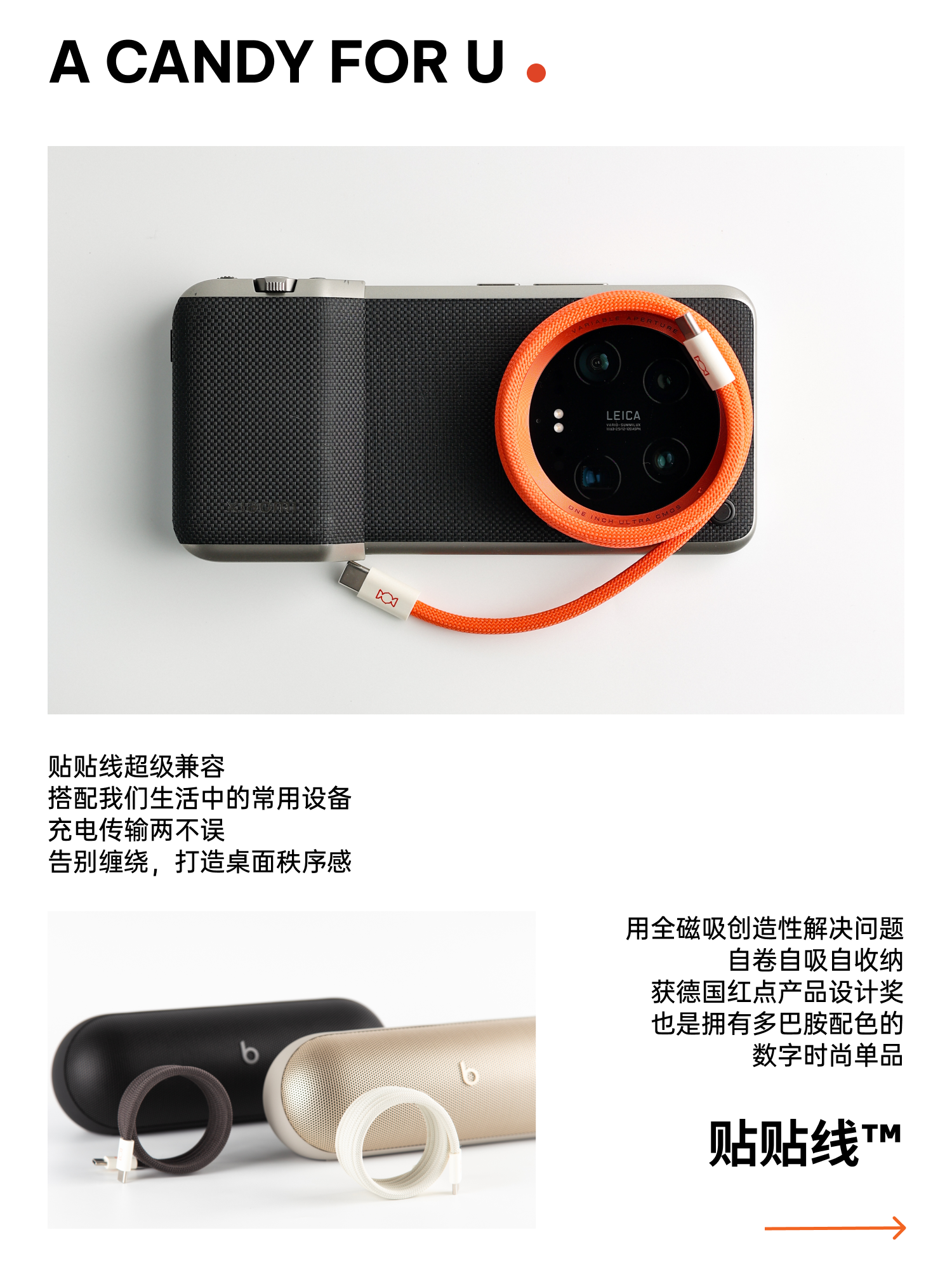 1️⃣ 贴贴线™️超市开放营业,数字时尚单品随心挑选:磁吸线的顶级体验拥有者,必须是贴贴线™️。它自卷自吸自收纳,也有多种时尚色彩,更获得了德国红点设计大奖,贴贴愉悦电能体验,贴贴数字时尚。