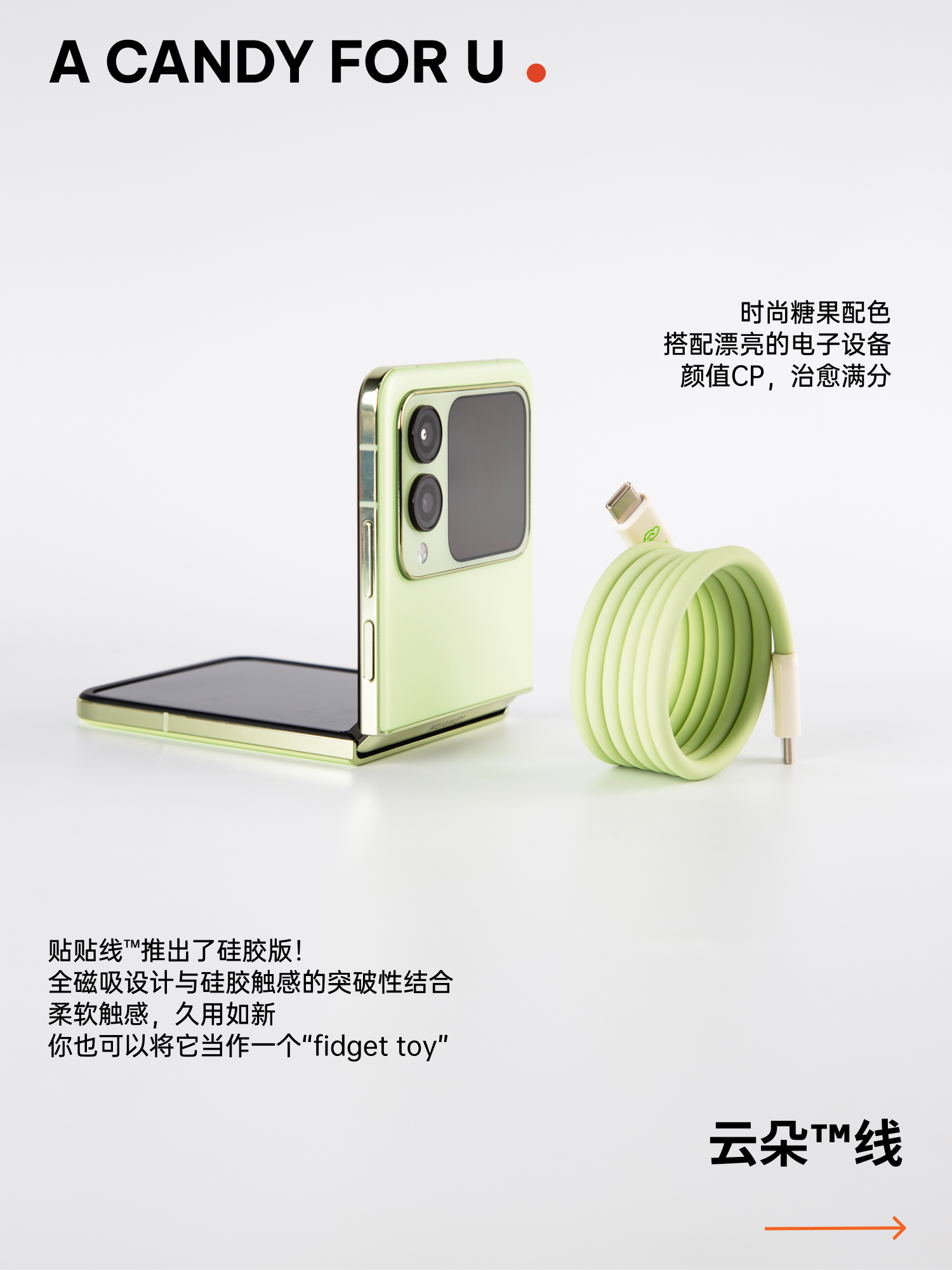 3️⃣ 首款硅胶皮肤贴贴线,云朵般愉悦触感:贴贴线™️推出了硅胶款——云朵线!它既有自卷自吸自收纳体验,更拥有云朵般的愉悦触感。柔软,解压,更久用如新。