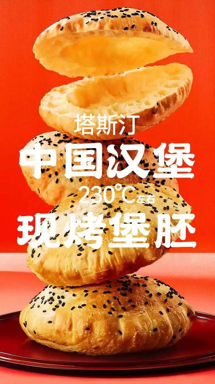 于是聪明的塔斯汀将汉堡和肉夹馍二合一了,将面包替换成中式烤饼,独创了手擀现烤堡胚,麦香+嚼劲,狠狠拿捏住了消费者。