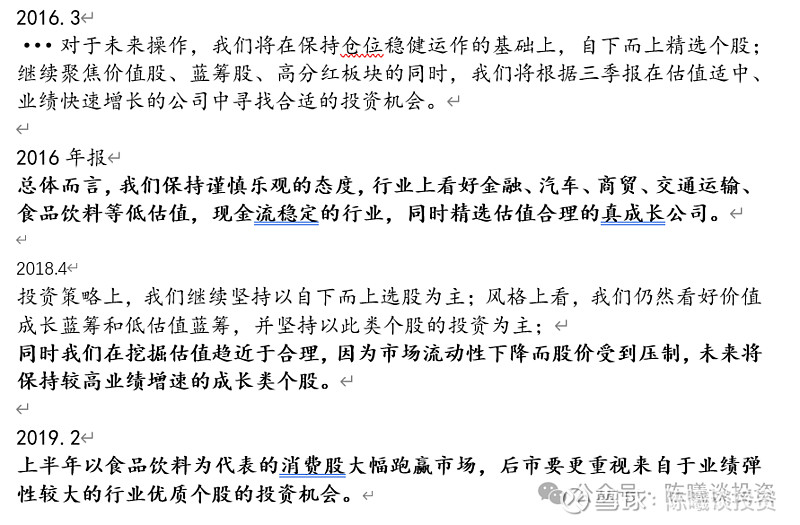 例如在刚入职中欧的15-16年初,曹名长就表达了自己要坚持投资“低估值蓝筹”的观点;
