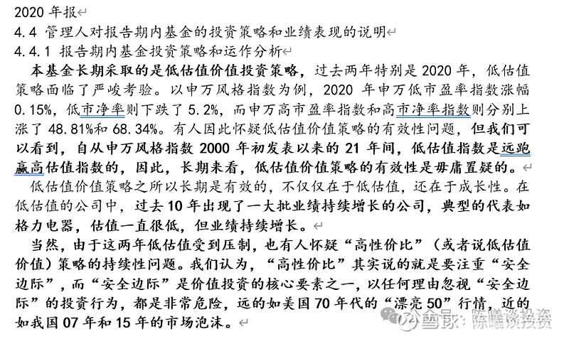 在20年年报中,他也直接表示“本基金直接采取的是低估值价值投资策略”;