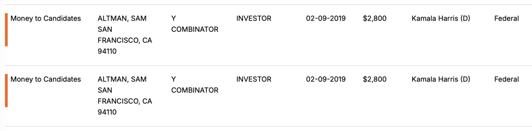 Sam Altman 曾向哈里斯捐款|来源:OpenSecrets