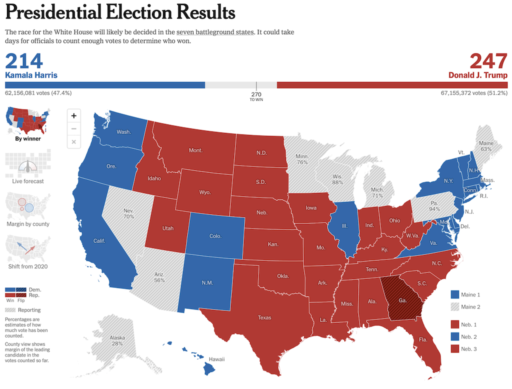 截至北京时间 11 月 6 日 15:00 的选举人票结果|图片来源:NYT
