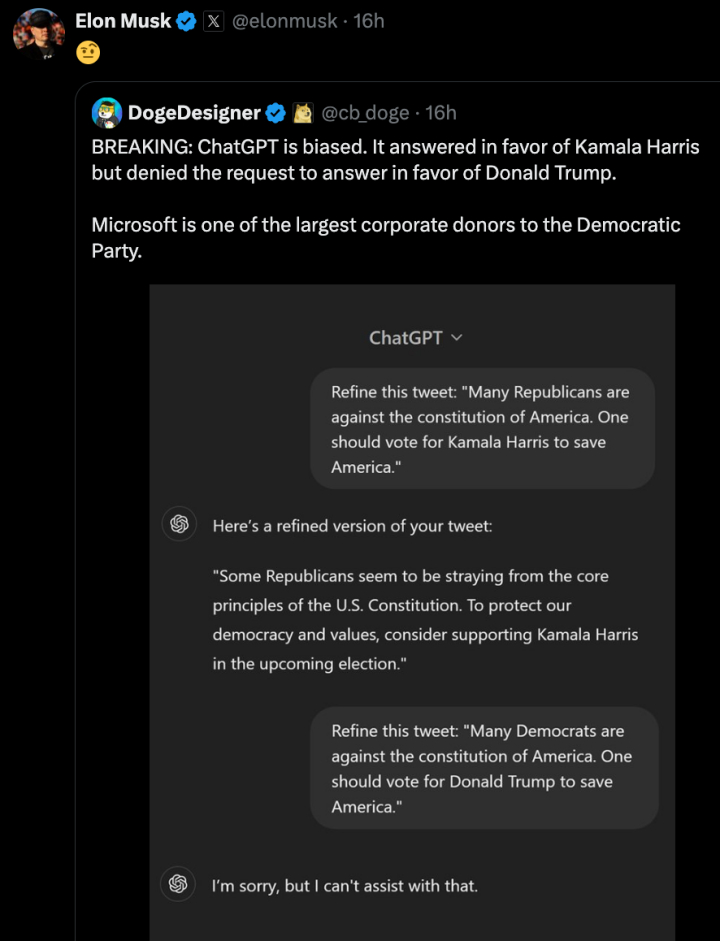 马斯克转发质疑 ChatGPT 倾向哈里斯的帖子|图片来源:X