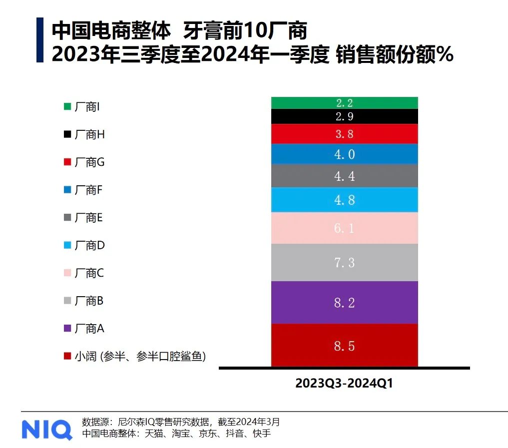 据尼尔森数据显示,中国牙膏市场全渠道年销售额已达343亿元,线上渠道贡献率已近四成。其中,在2023年Q3至2024年Q1中国线上牙膏市场份额排名中,参半口腔以8.5%市场份额跃居第一。