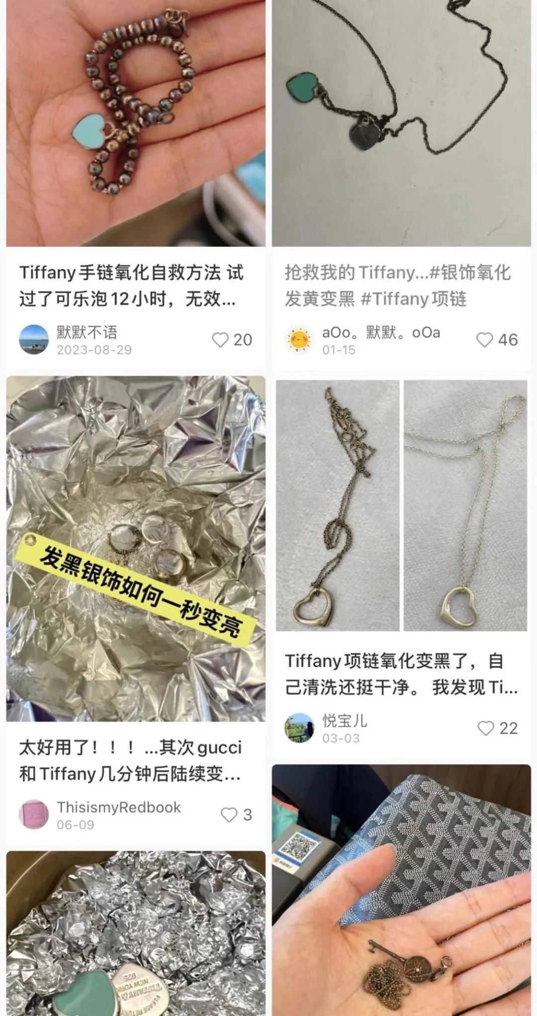 像滢滢一样吐槽蒂芙尼Tiffany首饰氧化变黑的女孩子,在社交平台上数不胜数,小红书有关Tiffany的话题中有很大一部分都是关于去除氧化痕迹的方法分享。