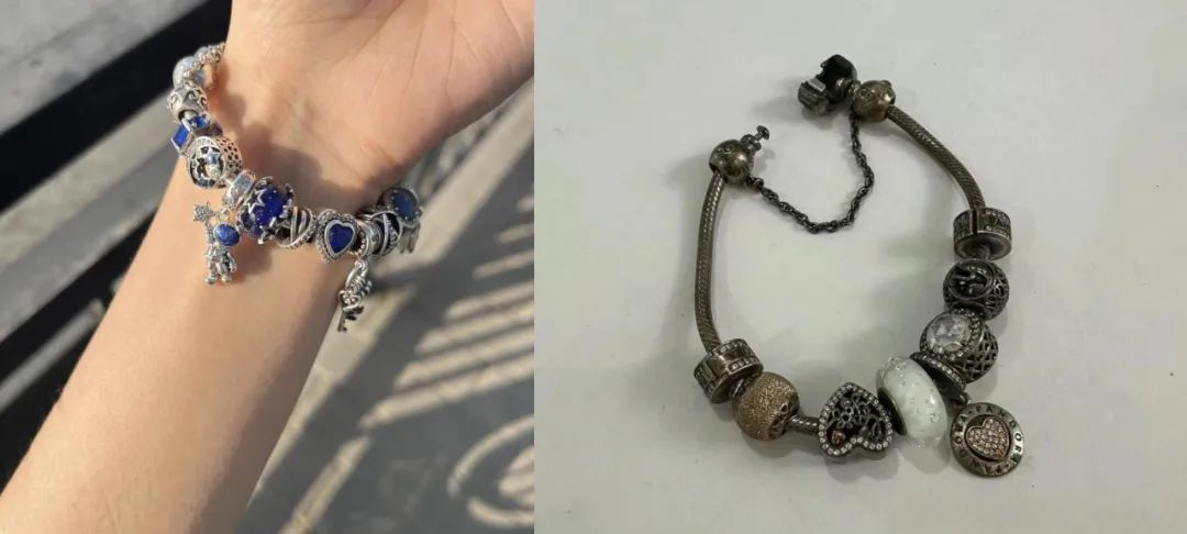 几乎没有人会只戴一条素链出门,就算串上两三个珠子也会略显寒酸,七八个珠子基本成了标配,因此才有了那句广为流传的“一入潘门深似海,一颗一颗往家买”。但由于材质问题,潘多拉饰品和蒂芙尼平价款一样,都容易出现氧化问题。虽然专柜可以免费清理,但终究是给消费者带来了额外的负担。