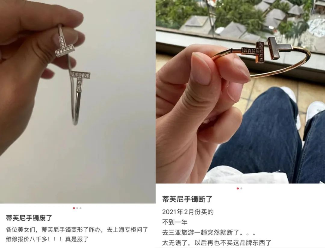 另外,蒂芙尼的首饰经过长时间佩戴后往往面临着较大程度的折旧,不仅是银质氧化变色,还有首饰主体变形等问题。比如流行款双T手镯,18K玫瑰金镶0.11克拉钻石的材质官网售价3.42万元。这样一款品牌溢价极高的产品,却很容易因为多次开合佩戴导致变形,造成两端T形结构变得不对称,甚至断裂。一旦出现此类问题,在二手市场上出售时也会进一步降价。