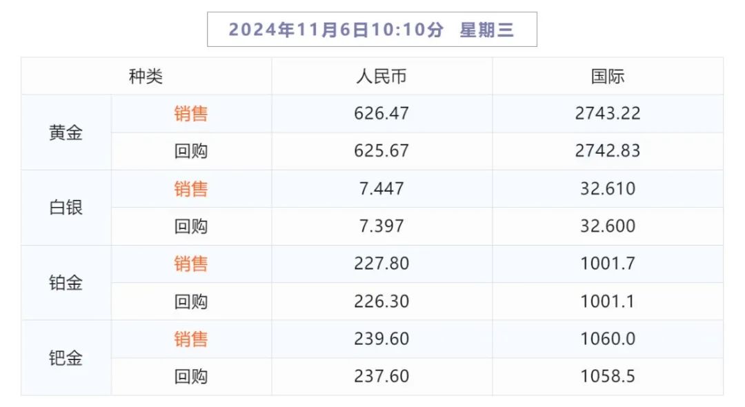 11月6日,国际金价再次迎来一次明显上涨,达到2743.80(美元/盎司),涨跌幅度达到7.32%。同时,国际金价(人民币/克)也相应上涨至626.55元人民币,涨跌幅度为1.67%。周生生黄金价格报价813元/克,老凤祥814元/克。