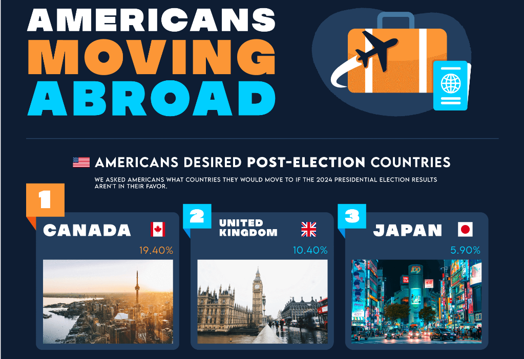 根据为游戏玩家提供新闻、信息和研究的Casino.org网站此前进行的一项调查,21%的美国人表示,如果他们支持的候选人在大选中落败,他们会考虑移居海外。