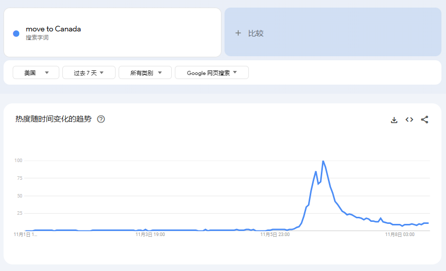 谷歌趋势(Google Trends)——谷歌旗下一款基于搜索数据的分析工具——显示,在特朗普将重返白宫的消息传出后,与“离开这个国家”和“如何移居……”相关的搜索量激增。