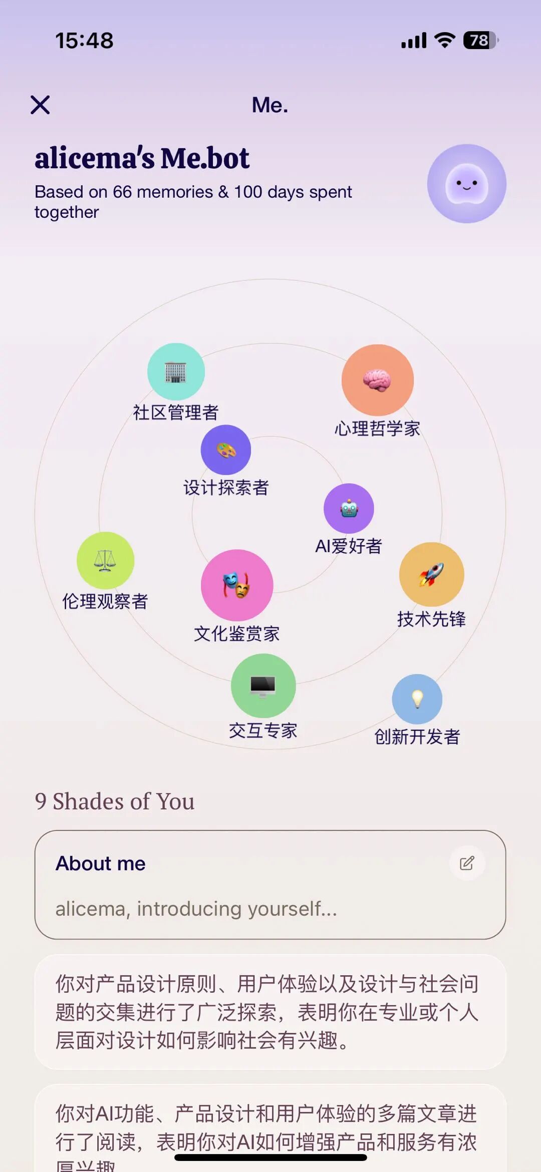 但其实,即便是 Me.bot 现有的形态和功能,我们还是看到了很多用户进来之后,非常喜欢,它切实地起到了一些我们想要的作用,这会让我非常开心。