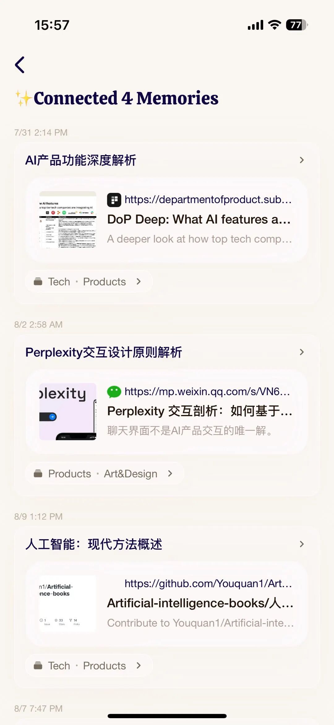 当我们向普通用户介绍的时候,还是会采用一些更日常、高频的 use case。比如想法记录,笔记归纳等等。但当他们开始使用 Me.bot 的时候,就会自然感受到它与 Notion、Evernote 等产品的不同,比如记录一个链接,Me.bot 会立刻给你一个反馈,这样的功能接触多了之后,Me.bot 的整体概念就留在了用户的印象里。