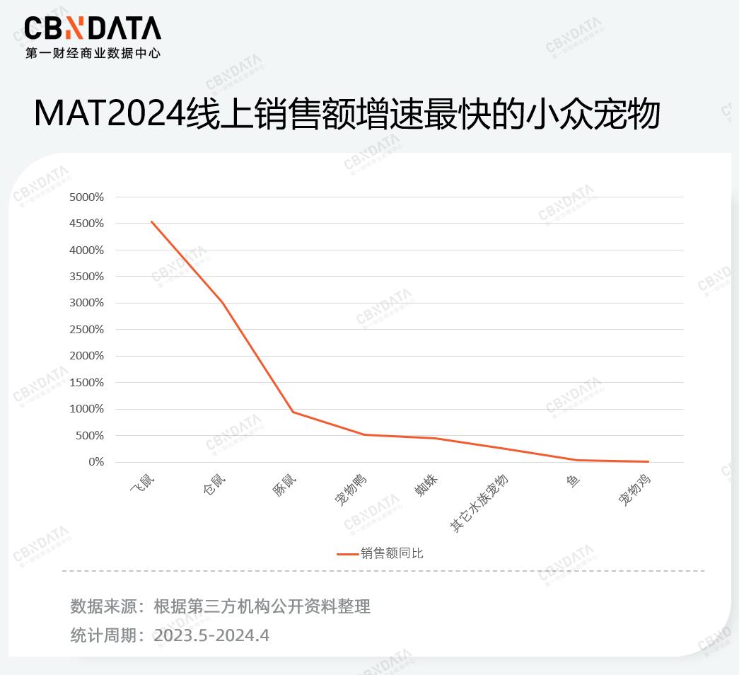 另一方面,从销售增速来看,鼠类成为异宠界的“显眼包”。根据第三方机构公开数据显示,过去一年,线上销售额增速最快的三大异宠分别是飞鼠(蜜袋鼯)、仓鼠、豚鼠,其中仓鼠在鼠类中销售额占比最大,以绝对性的优势引领着大盘增长。
