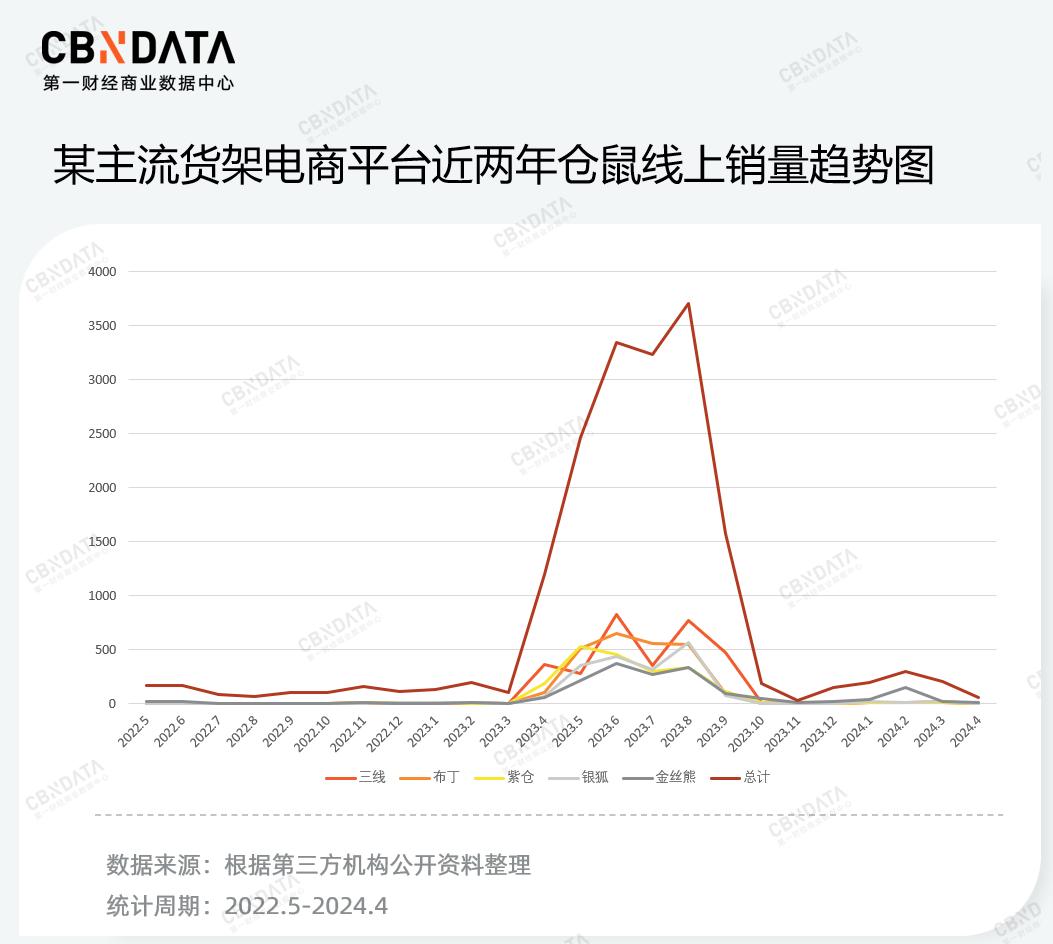 鼠类为什么能成为年轻人的“新宠”?我们通过仓鼠销售趋势的关键时间节点来进行分析。销量数据显示,自2023年3月起,三线、布丁、银狐等仓鼠品种的销量迅速攀升,直到10月份达到顶峰后逐渐回落,进入平稳阶段。