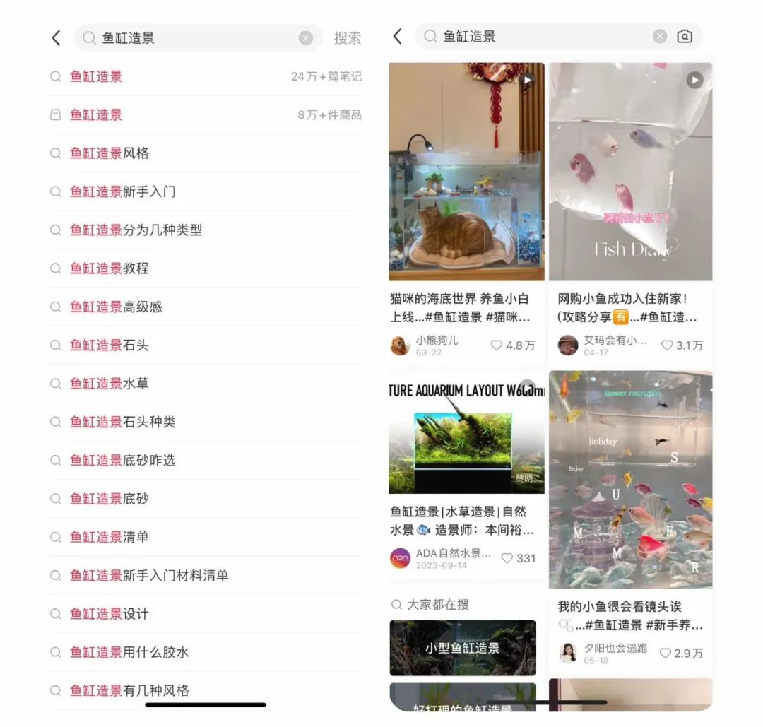 与此同时,追求个性的年轻人催生出多元化的造景风格。从卡通动漫、中国风,到日式简约、自然生态,多样的造景风格满足着他们不同的审美需求。在小红书平台,关于“鱼缸造景”共有24万+笔记,宠物主在此晒经验、求同款,外观精美的水缸造景成为他们彰显个性的一部分。