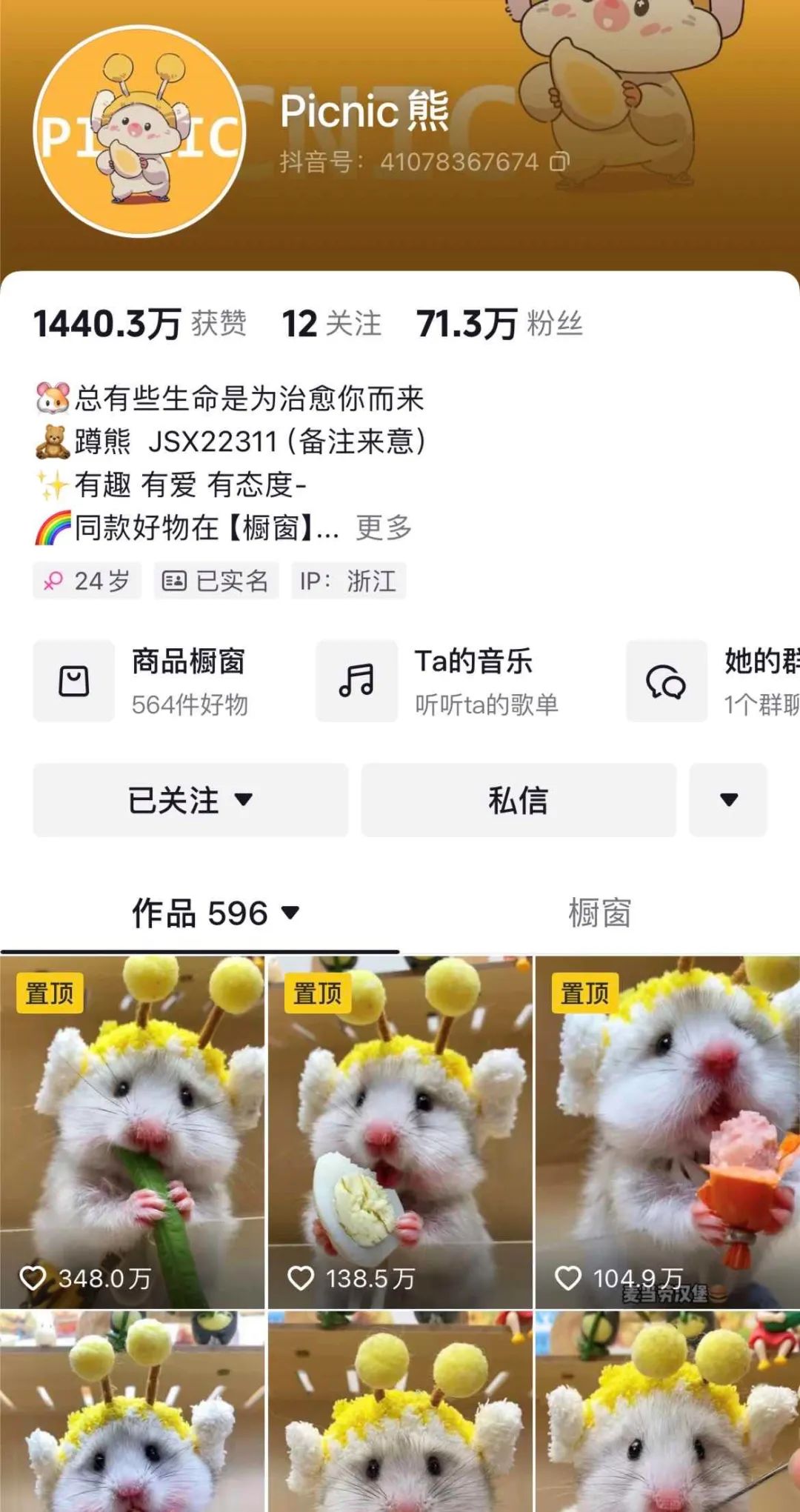 同时,一些仓鼠博主靠着仓鼠吃播、仓鼠换装等视频涨粉无数,吸引着众多年轻人排队入坑。比如抖音博主Picnic熊,凭着仓鼠吃播收获71.3万粉丝,其视频最高点赞量超过348万。评论区中,众多网友表示被视频治愈,无忧无虑干饭的仓鼠成为他们的“dream life”。