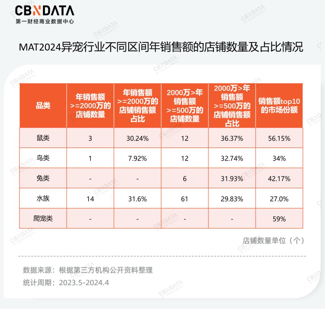 观察整体市场格局,我们发现异宠行业超头部店铺年销售额在2000万元以上,而500万则是区分头部和中肩部店铺的分水岭。因此,我们将店铺按年销售额分为三个区间:2000万元以上、500万元至2000万元,以及500万元以下,以分析各区间的店铺表现。