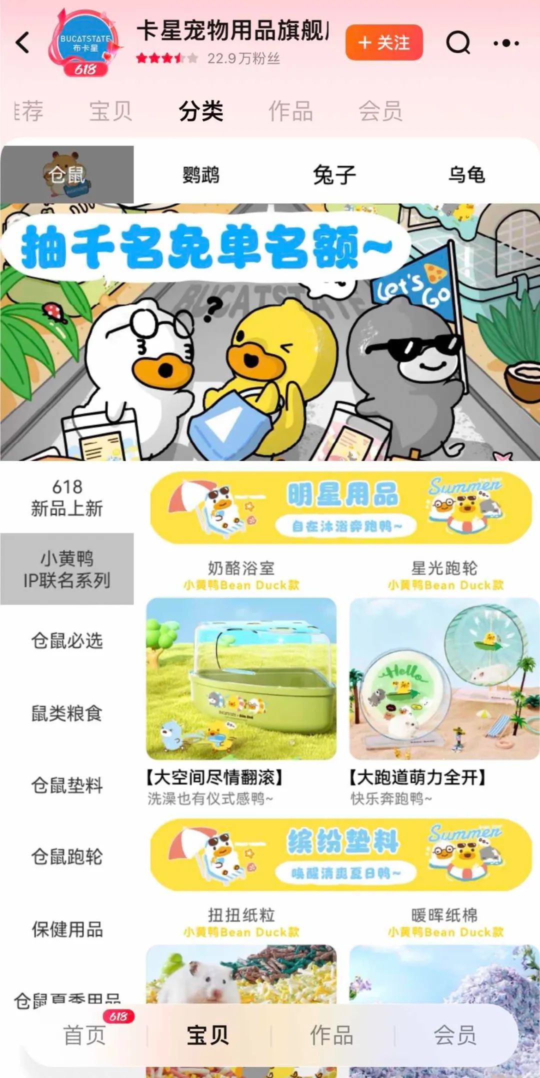 依靠差异化建立了初期的客户基础后,布卡星围绕仓鼠笼进行品类拓宽,逐步覆盖了垫料、跑轮等一系列刚需。同时,品牌对原有造景产品进行了迭代升级,如在空间上进行加大,推出70cm加大仓鼠笼,以及在垫料上升级玩法,从原料、气味、功能、季节、配色等不同维度对垫料进行细分,让消费者可以根据需要自由组合等。今年5月份,布卡星还和小黄鸭Bean Duck联名推出系列主题款小宠用品及外带笼,完成了从产品研发到品牌声量的不断进阶。
