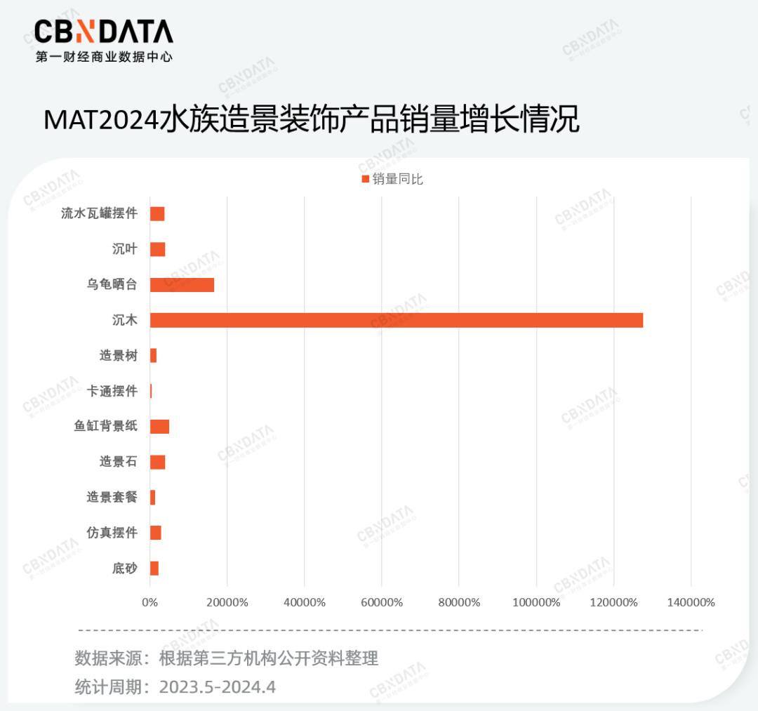多样化的风格也促进了新兴造景细分品类的发展。以中式风格为例,沉木、流水瓦罐和沉叶等造景用品在过去一年销量显著增长,尤其是沉木增长迅速,既能简单上手,又能为鱼类提供遮挡,因而成为新手玩家的热门选择。同时,鱼缸背景纸、造景石和造景套餐的销量也有所提升,一整套可以直接拿来用的懒人造景产品深受青睐,消费者对便利化造景的兴趣浓烈。另外,乌龟晒台的销量增速紧随沉木之后,可见随着桌面养龟趋势的兴起,鱼缸造景的周边产品正日益丰富。