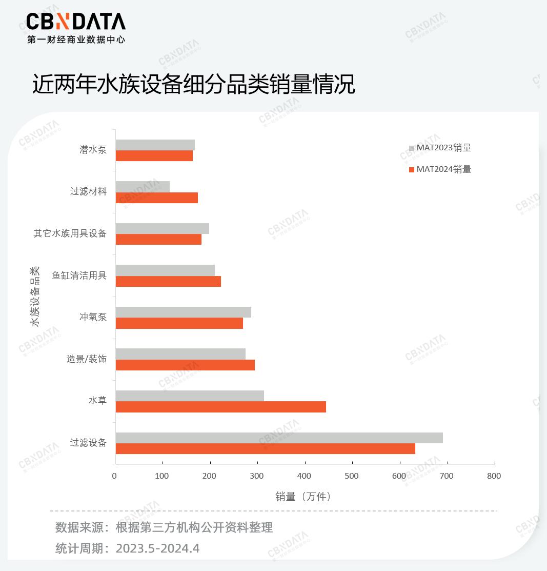 以鱼类为例,根据第三方机构公开资料整理,过去一年水族设备销量top3分别是过滤设备、水草和造景/装饰,其中造景/装饰品类同比增长7.7%,在高占比的情况下仍然保持了正增长,市场对此类商品的需求远未达到饱和。