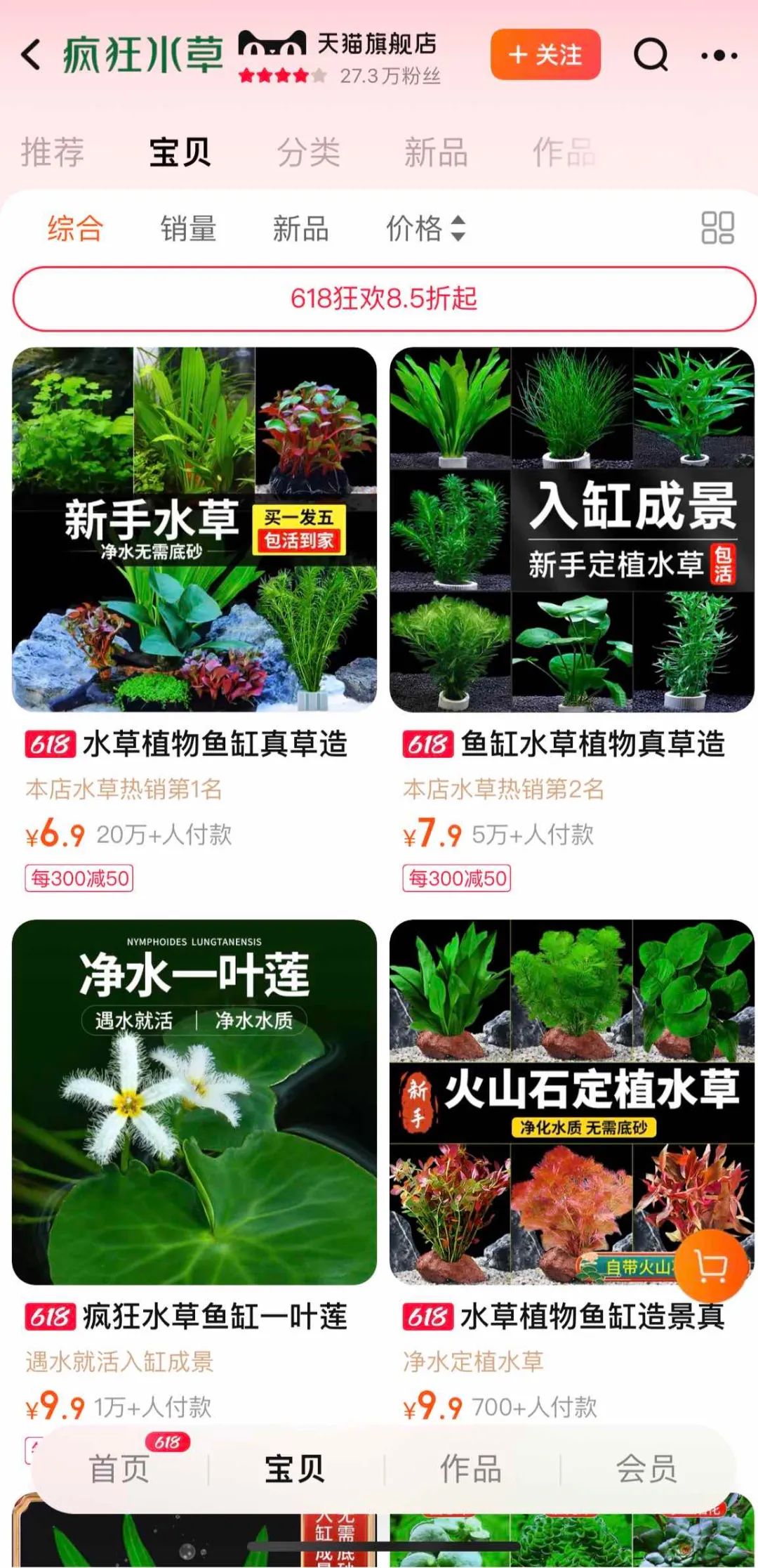 从布卡星的经营策略可以看到,其核心首先是聚焦了仓鼠造景这一细分品类,其次是在此基础上,通过场景和消费者痛点的挖掘,对品类进行持续的有效细分。 这种从细分品类成功卡位从而成为行业领导者的方式,在水族用品头部品牌“疯狂水草”的发展中也能看到影子。
