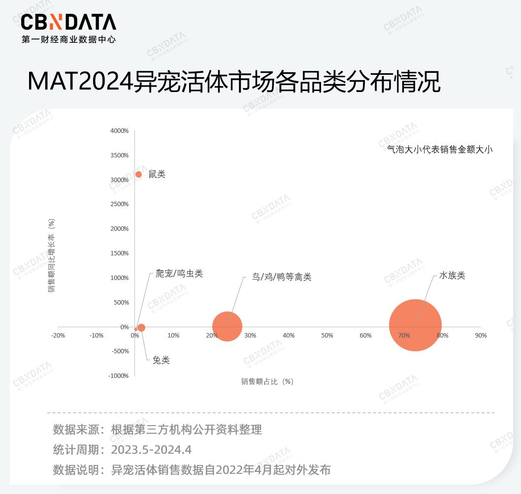 根据第三方机构公开数据显示,在异宠活体市场中,水族宠物凭借着饲养简单、高观赏性的特点,占据了市场的主导地位。过去一年,水族在异宠市场的销售额占比超过70%,其中鱼类在水族的市场份额接近9成。从具体品类上看,饲养门槛低、色彩斑斓的小型观赏鱼成为水族大热门,登顶MAT2024水族热销产品榜单。