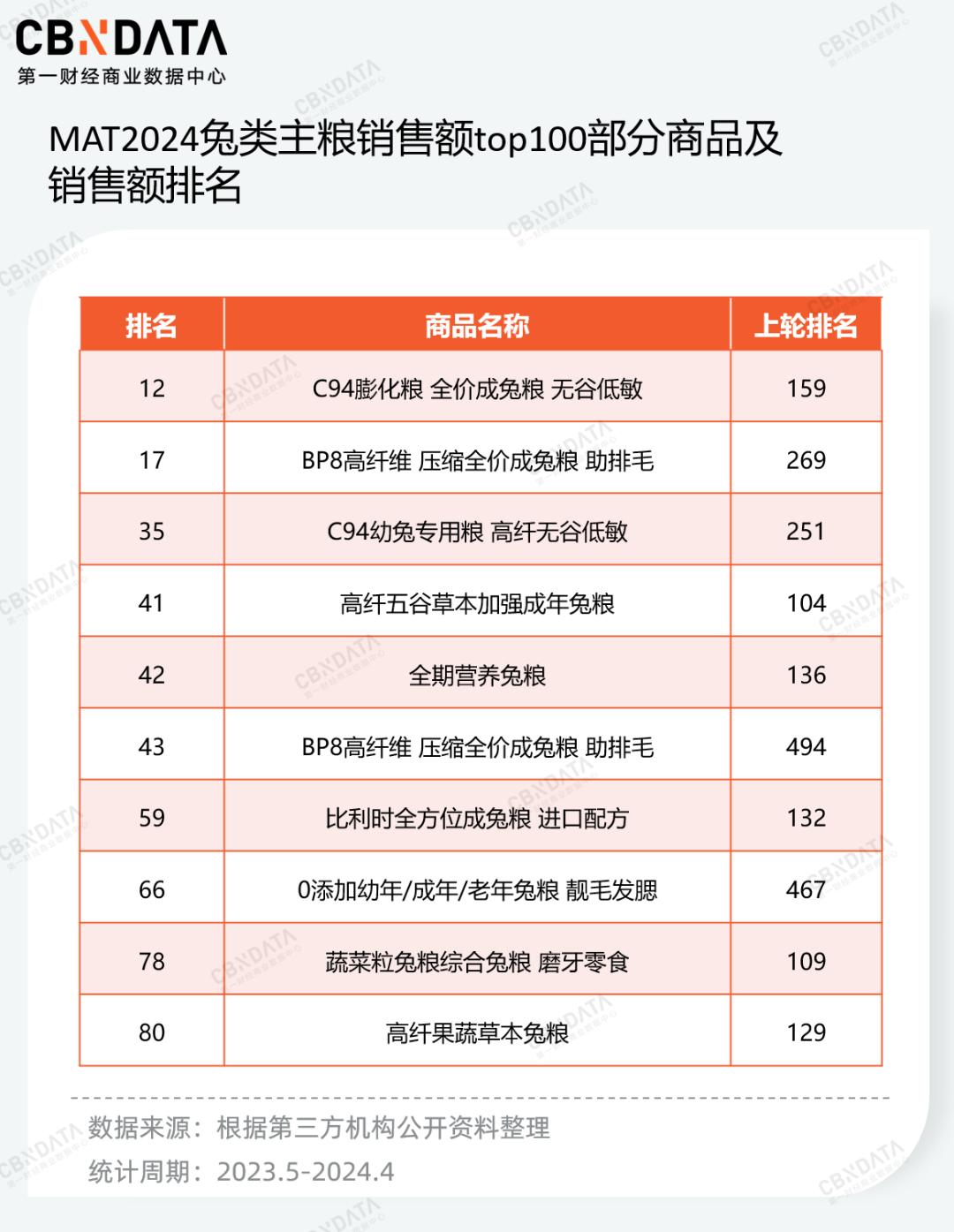 以兔粮为例,我们筛选了近一年销售额在top100但上轮排名不在前100的商品,发现这些跃迁增长的商品中,有超过一半的成交价格都在40元以上。品类不仅覆盖兔兔成长的全周期,也涌现出膨化粮、冻干粮、压缩粮等各种形态。在主粮营养上,绝大多数都添加了益生菌、酵素、植物成分等功能性成分,宠物主尤其关心兔兔的肠胃和毛发健康。其中,兔粮成交单价最高的是来自于比利时的进口兔粮,其产品描述中声称添加了牧草鲜蔬纤维、亚麻籽油、丝兰-yucca提取物等天然成分,在提升品质的基础上还优化了口感。