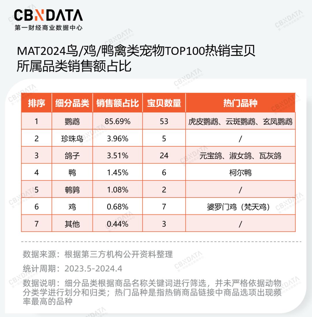 此外,除了鱼类和鼠类,鸟类同样展现出强劲的市场潜力。鸟/鸡/鸭禽类异宠不仅市场份额位列第二,且销售额增速位列第三。从热销产品上看,消费者更热衷于购买鹦鹉、珍珠鸟这种性格友好、会教说话的鸟类品种,而宠物鸡和宠物鸭的市场份额相对较小。