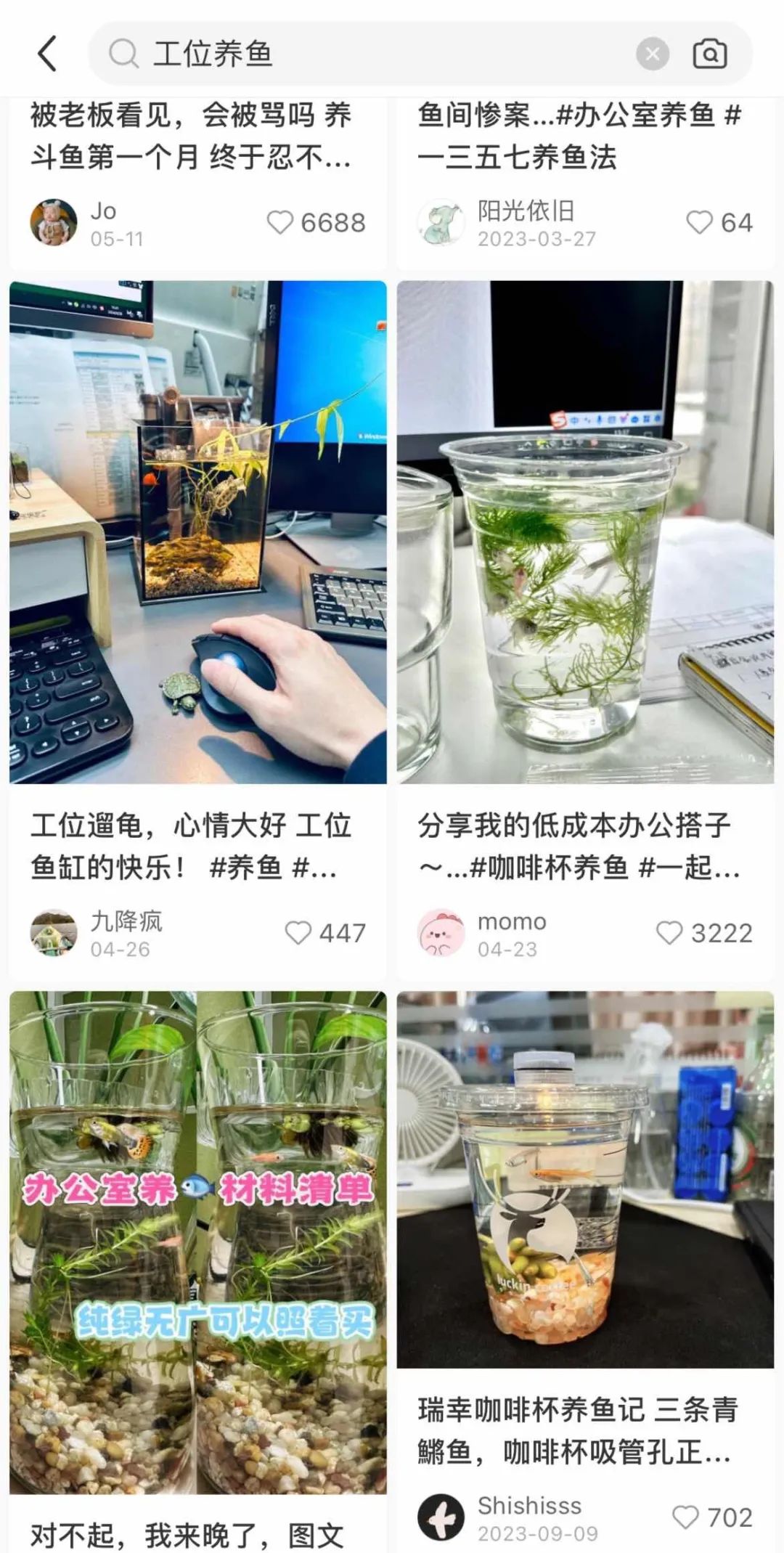 和过去的居家饲养不同,如今的年轻人找到了新的养鱼方式——工位养鱼。一张办公桌、一个小型浴缸,加上几条高颜值的热带鱼,就能为自己打造一个可以放松的“缓冲带”。在小红书搜索“工位养鱼”关键词,一大批“摸鱼选手”现身说法,有人推荐高颜值的玻璃缸,有人分享如何用瑞幸杯养鱼,还有人坚持不换水的古法养鱼,主打一个懒人、便利、松弛感。