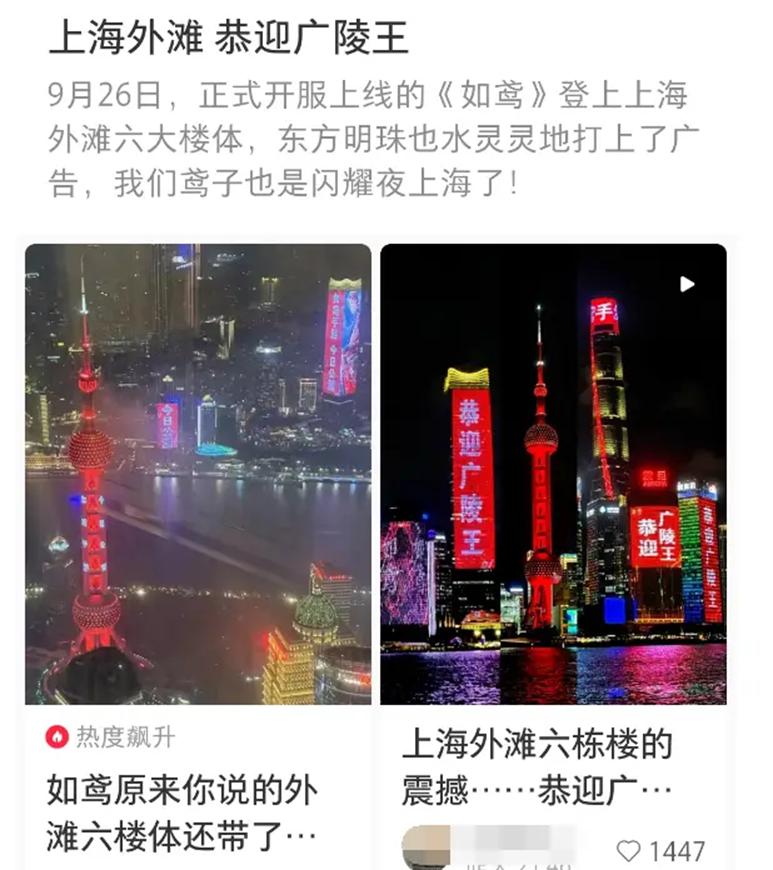 图:灵犀互娱为庆祝《如鸢》上线而在上海外滩六大楼体与东方明珠打出巨幅广告