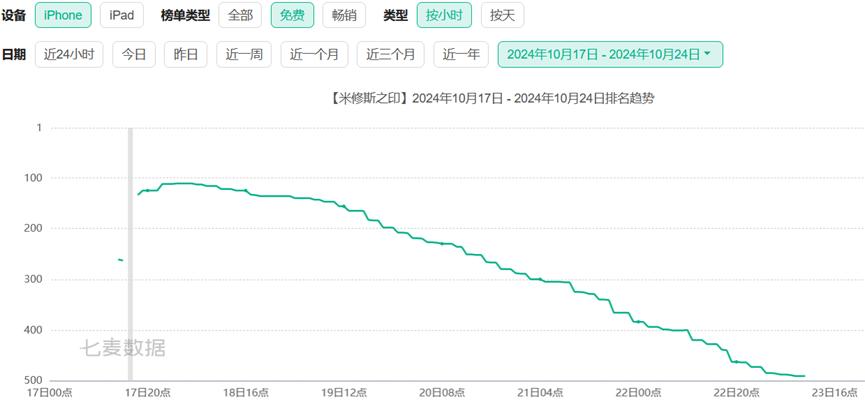 但女性向游戏市场的火热依然吸引了越来越多的厂商入局,在这条赛道上前赴后继的厂商依然大有人在,比如中青宝的首款乙游《米修斯之印》是《如鸢》后女性向赛道又一挑战者,相较于《如鸢》,《米修斯之印》的系统更贴近传统乙游,主打与男主的文字类陪伴互动,整体也具备一定的“后宫向爽文”要素。只是《米修斯之印》仅在免费榜上短暂地呆了一段时间,在畅销榜上查无此游。