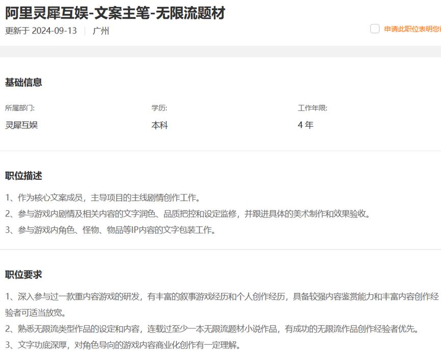 图:灵犀互娱官网正在招聘无限流题材的文案主笔