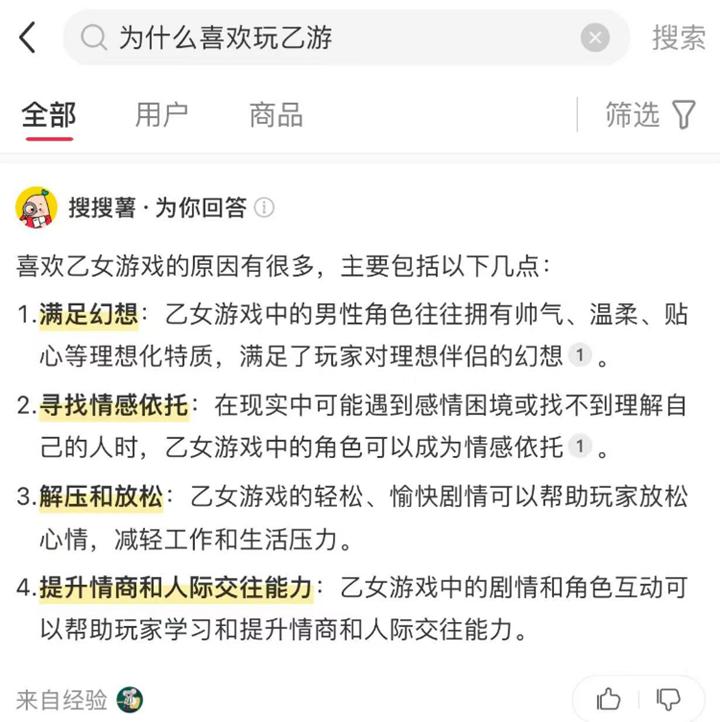 图:小红书上搜索“为什么喜欢玩乙游”,搜搜薯自动给出的答案
