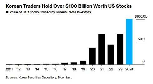 🇰🇷韩国散户投资者对美国股票的兴趣日益浓厚,截至11月7日,其持有的美国股票总价值已超过1000亿美元,达到1014亿美元,同比增长64%。