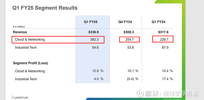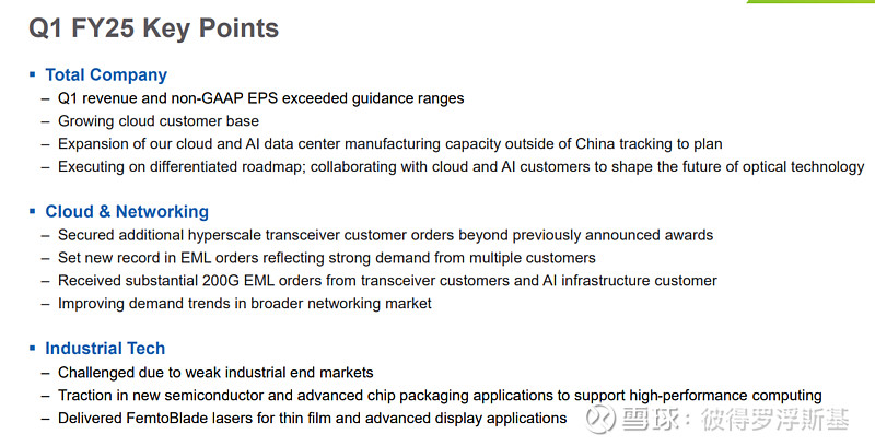 先看经营摘要,lite 25Q1实现净营收为3.369亿美元 GAAP毛利率为23.1%;非GAAP毛利率为32.8% GAAP运营亏损为24.5%;非GAAP运营利润率为3.0% GAAP稀释后每股净亏损1.21美元;非GAAP稀释后每股净利润0.18美元。