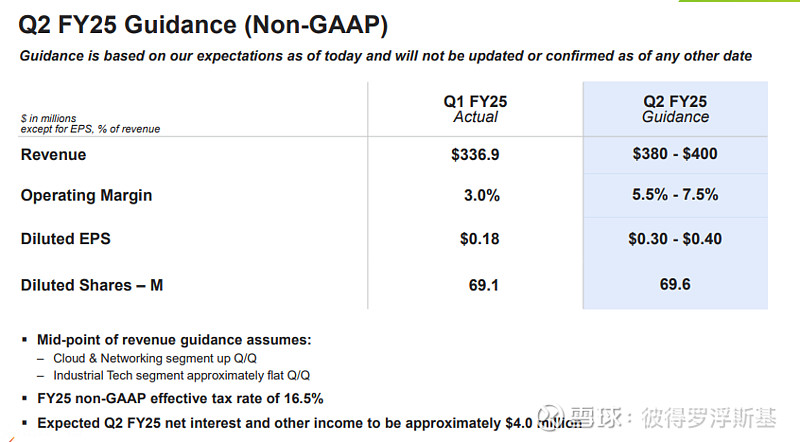2025财年第一季度的非公认会计原则净收入为1220万美元,合稀释后每股0.18美元。2024财年第四季度的非公认会计原则净亏损为890万美元,合稀释后每股0.13美元。2024财年第一季度的非公认会计原则净收入为1610万美元,合稀释后每股0.24美元。