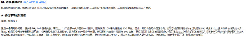 关于1.6T,很多客户对 1.6T 很感兴趣,事实上,1.6T 是下一代产品的一个版本。还有使用 200G通道的 800G光模块。因此,我们将在组件层面参与,正如我在脚本中谈到的,我们的 200G EML,这将在明年夏天进一步增加。但我们今天处于资格认证阶段,今天已经收到了批量订单。因为我们的产能非常有限。所以我们将在组件层面与 EML 合作,然后我们将在收发器层面合作。我们已经向客户提供了收发器样品,反馈非常非常积极,就像我们在上次电话会议上谈到的那样。所以我们在追逐,我们在游戏中,我们只需要继续努力获得资格。然后时间也取决于客户。所以有些人比其他人更早准备好。但我想说,到明年年底,1.6T 应该会大幅增长。