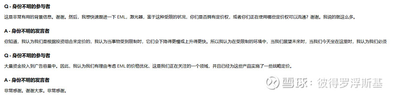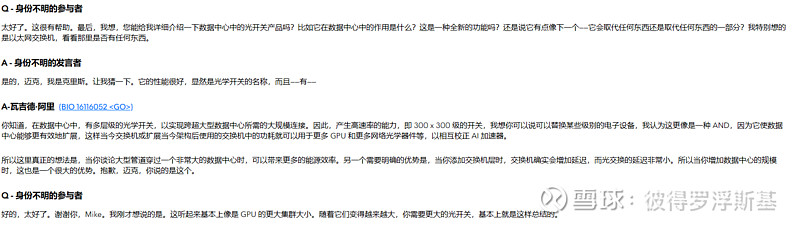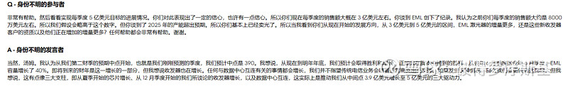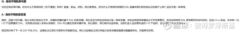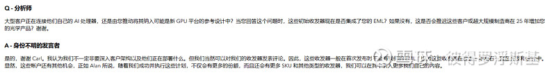 继续高质量QA,为什么不用eml做自己的光模块,哈哈,看公司怎么说的:是的,这是个好问题。我认为我们有硅光子学、多模收发器和基于 EML 的收发器。我们正在为特定应用设计每一种收发器。有些应用使用单模硅光子学效果更好。有些应用使用 EML 具有更好的成本结构。正如 Chris 所说,许多新一代 1.6T 产品更喜欢 EML,尤其是当你进入多波长领域时,EML 可以真正发挥关键作用。所以是的,我们绝对会这样做。当我们进入这些更先进的 1.6T 产品时,这可能在下半年更有意义。