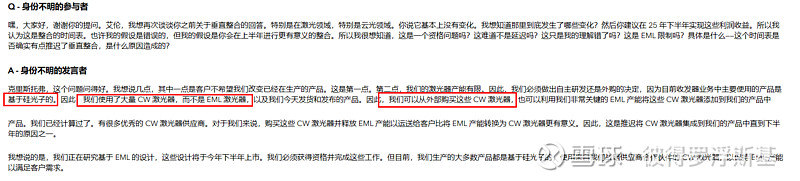 重点,关于硅光和eml,我想说几点,其中一点是客户不希望我们改变已经在生产的产品。这是第一点。第二点,我们的激光器产能有限。因此,我们必须做出自主研发还是外购的决定,因为目前收发器业务中主要使用的产品是基于硅光子的。因此,我们使用了大量 CW 激光器,而不是 EML 激光器,以及我们今天发货和发布的产品。因此,我们可以从外部购买这些 CW 激光器,也可以利用我们非常关键的 EML 产能将这些 CW 激光器添加到我们的产品中。