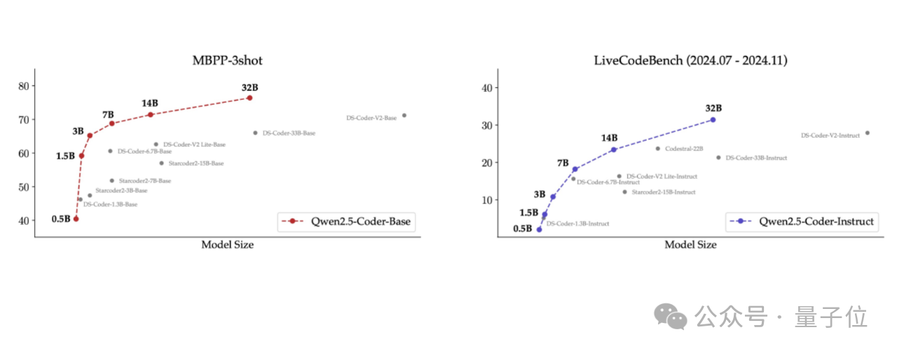 团队评估了不同尺寸Qwen2.5-Coder在所有数据集上的表现,不但均取得同等规模下最佳性能(无论开闭源),并且还验证了Scaling Law依旧奏效。