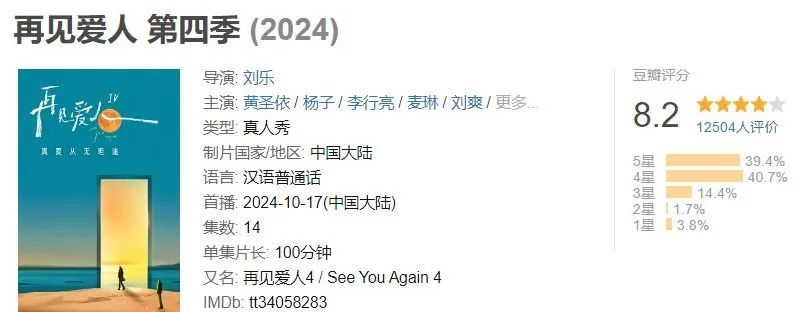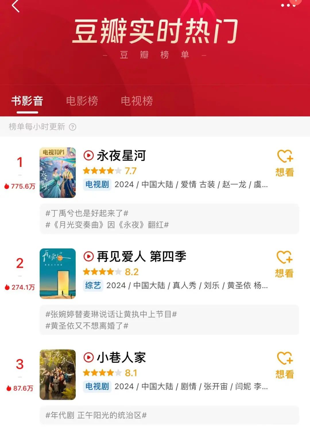 10月开播的芒果综艺《再见爱人4》,开播即出圈。三对嘉宾成就自媒体频繁讨论的话题,目前该综艺在豆瓣实时热门和书影音榜单排名第二。第三名是同样出自芒果TV的《小巷人家》。