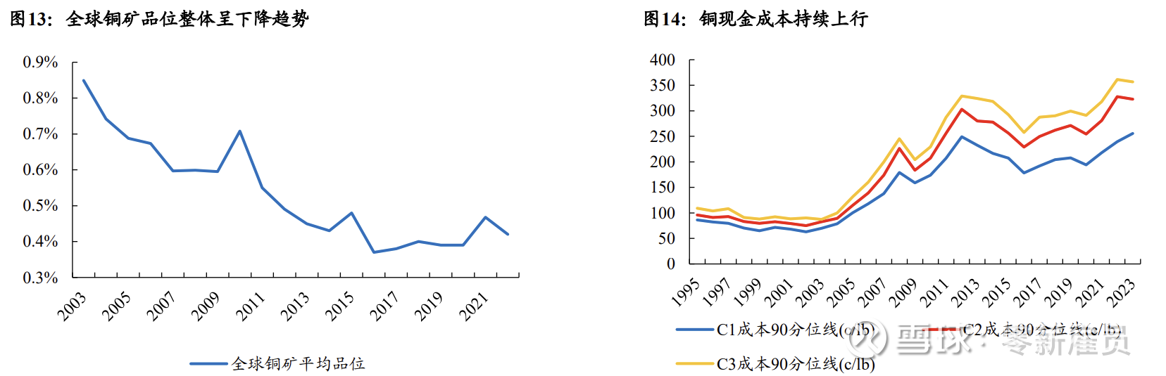 铜矿品位下滑,铜企现金成本抬升。2003年-2022年,全球铜矿平均品位快速下行,由2003年的0.85%下降至2022年的0.42%,资源禀赋快速下滑进一步抬升了企业现金成本。叠加通胀因素带来的人工、原材料等成本因素提升,全球铜现金成本持续上行,2023年全球C1现金成本90分位线约为2.6美元/磅,较2008年同比提升约42.59%。我们认为行业成本上行,将要求更高的资本开支强度,并支撑铜价中枢逐步上移。