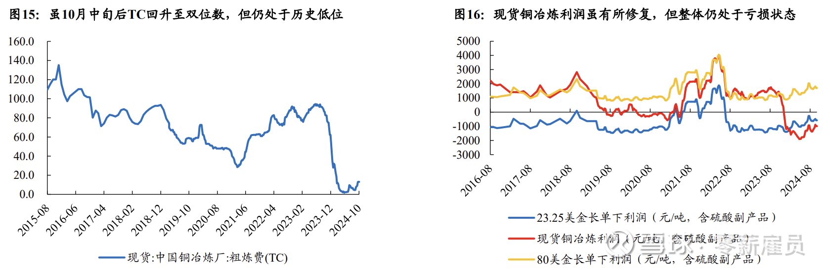 从中游冶炼端来看,TC费用虽环比改善,但仍处于历史低位。铜冶炼企业利润主要包括两部分:加工费(TC/RC)和副产品收益(主要为硫酸、金、银等)。截至11月8日,国内现货粗炼费(TC)年内均值仅为11.58美元/干吨,较2022年和2023年TC分别下降86.30%和85.15%,结合冶炼环节的现金成本和副产品硫酸价格进行测算,当前TC价格下,冶炼厂已处于现金流亏损的状态,但由于大型铜冶炼企业通常与铜矿企业签订长协订单,长协较高的Benchmark使冶炼厂利润获得保障。但由于长协订单签订周期仅为一年,2025年长协TC价格将于2024年年底重新签订,预计新协定TC价格约30-40美元/干吨,部分冶炼厂或面临现金流的亏损,国内冶炼产能减产趋势有望在2025年更加明朗。