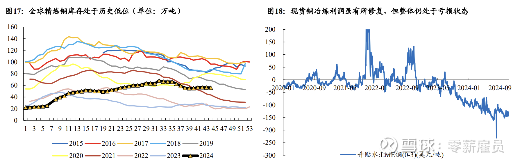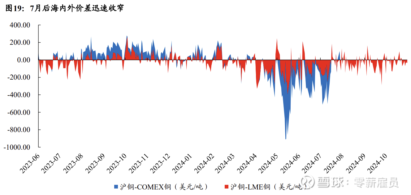 从地区价差看,上半年铜价上行起源于海外,COMEX铜价与LME铜价相较国内存在明显溢价。由于地区间供需存在差异,不同地区交易所铜价存在一定的价差。复盘2016年海内外价差走势,超过75%的时间内(包括2020年3月-2022年4月铜价高景气)沪铜对COMEX铜、 LME铜存在相对溢价,即需求面以国内需求为主导。但2024年4月-2024年8月,沪铜对COMEX铜、LME铜的价差由负转正并迅速放大,反映了本轮铜价上涨的需求主导方来自海外而非国内,海外铜供需相较国内更为紧张。