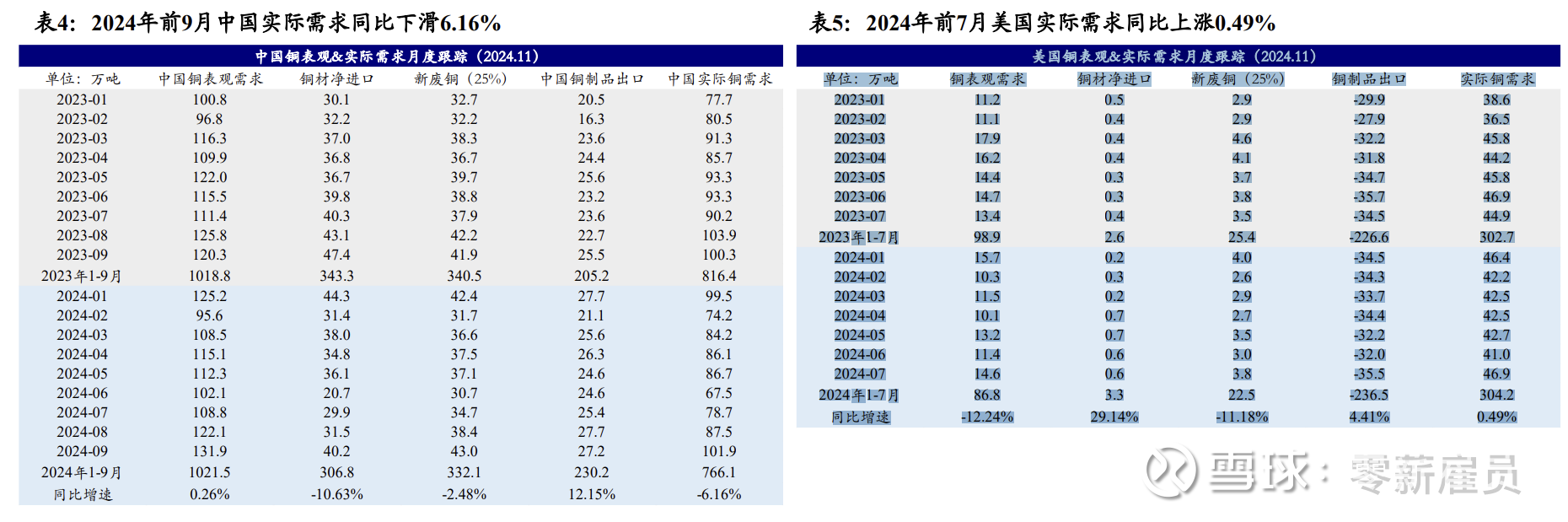 从实际需求看,2024年中国实际需求略有萎缩,美国实际需求表现优于表观需求。中国作为全球最大的铜消费国,2024年前九月表观需求维持正增长,铜制品出口亦同比增长约12%,但由于铜材进口量减少,中国实际铜需求同比下滑超6%;美国由于缺少铜冶炼或铜加工产能,表观需求体量有限,2024年前七月美国表观铜需求同比下降约12%,但作为全球最重要经济体之一,美国铜制品进口量超过200万吨,2024年前七月主要铜制品进口量同比增加4.4%,实际铜需求同比增长0.5%。