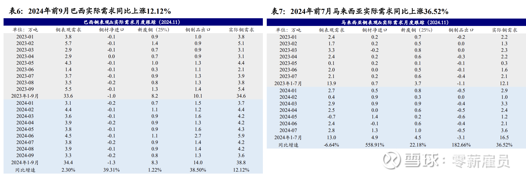 新兴经济体实际需求量或超预期。2024年前九月,巴西表观需求同比增长2.3%,但受益于主要铜制品出口量同比高增38.5%,实际铜需求同比增长12.1%至38.8万吨;2024年前七月,马来西亚铜精矿及阴极铜净进口均同比下滑,表观需求同比下滑6.6%,但考虑到铜材及主要铜制品净进口同比高增(分别同比增长559%和183%),马来西亚铜实际需求同比增长36.5%。