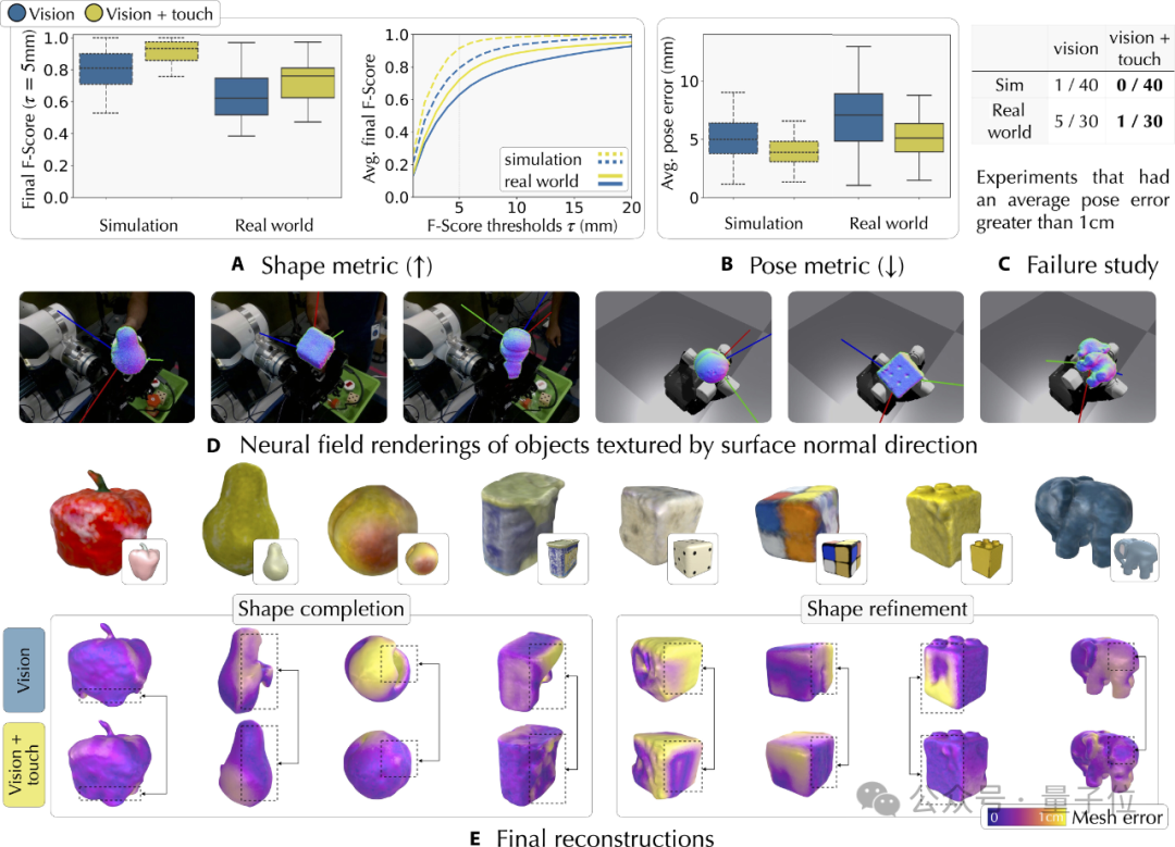在物体重建方面,研究发现结合触觉信息后,表面重建精度在模拟环境中平均提高了15.3%,在真实世界中提高了 14.6%。